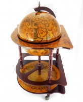 Бар-глобус напольный угловой. Мини-бар оснащен колесиками на стойках, что позволяет свободно перемещать его при необходимости. Благодаря тому, что столик бара имеет угловую форму, он не занимает большое пространство, а, следовательно, может быть использован в небольших помещениях. Стильный и функциональный способ хранения бутылок со спиртным